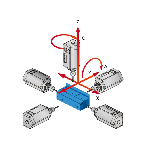 Centrele in 5-axe cu cap rotativ permit prelucrarea de piese mai grele decât centrele in 5-axe cu masă rotativă. Datorita mesei mari de lucru, aceste mașini ofera posibilitatea montarii unui dispozitiv suplimentar de fixare pentru prelucrări multiple. Componentele de calitate superioara, cum ar fi: ghidajele liniare sau arborele principal integrat în motor, permite centrelor de prelucrare în 5-axe aplicații de prelucrări complexe.