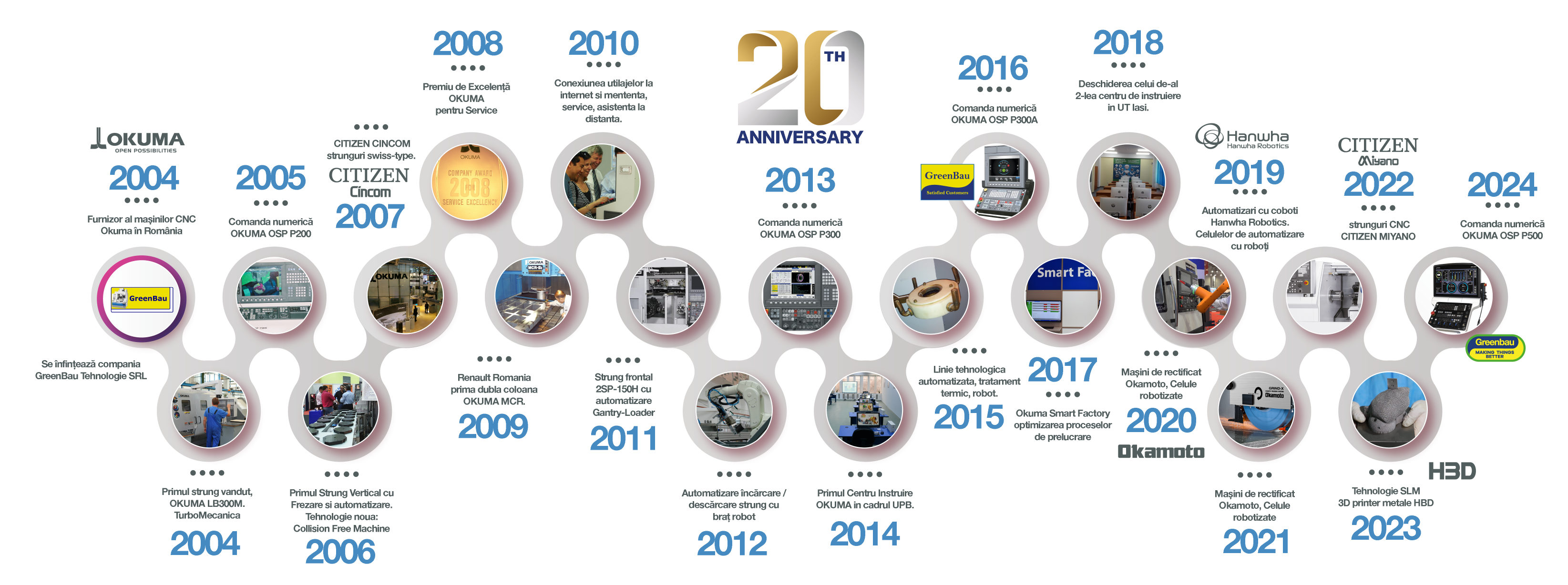 Aniversăm 20 de ani de excelență în industria românească ca furnizori de tehnologii de prelucrare prin așchiere a metalelor. De la introducerea primelor mașini-unelte CNC Okuma, strunguri swiss-tip Citizen, sau mașini de rectificat Okamoto până la tehnologiile de printare 3D de metale HBD, Greenbau Tehnologie SRL a fost la vârful inovației, aducând cele mai avansate soluții tehnologice pentru industrie.