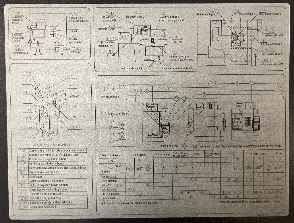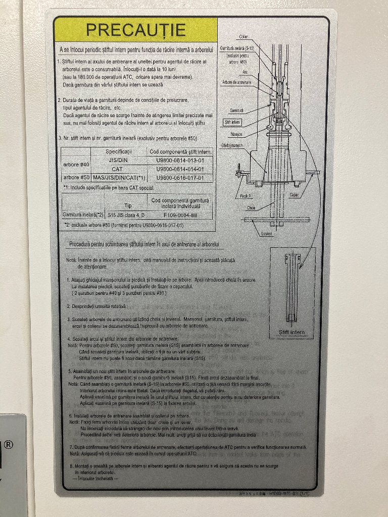 Verificați și înlocuiți știftul intern pentru funcția de răcire internă a arborele principal. Procedura de lucru este stabilită în Secțiunea 5 din Manualul de operare și întreținere. Această procedură de întreținere este, de asemenea, documentat pe partea laterală a mașinii CNC.