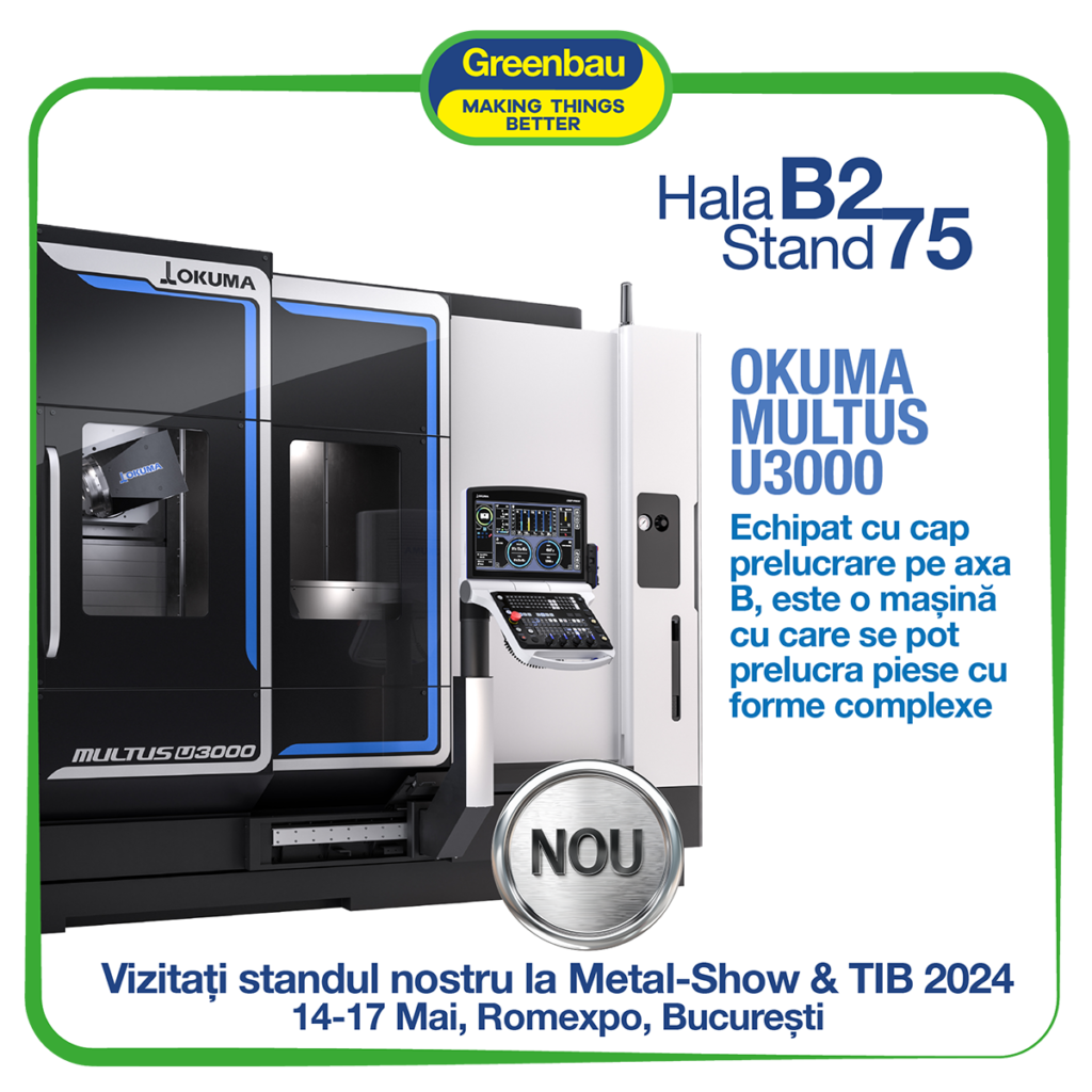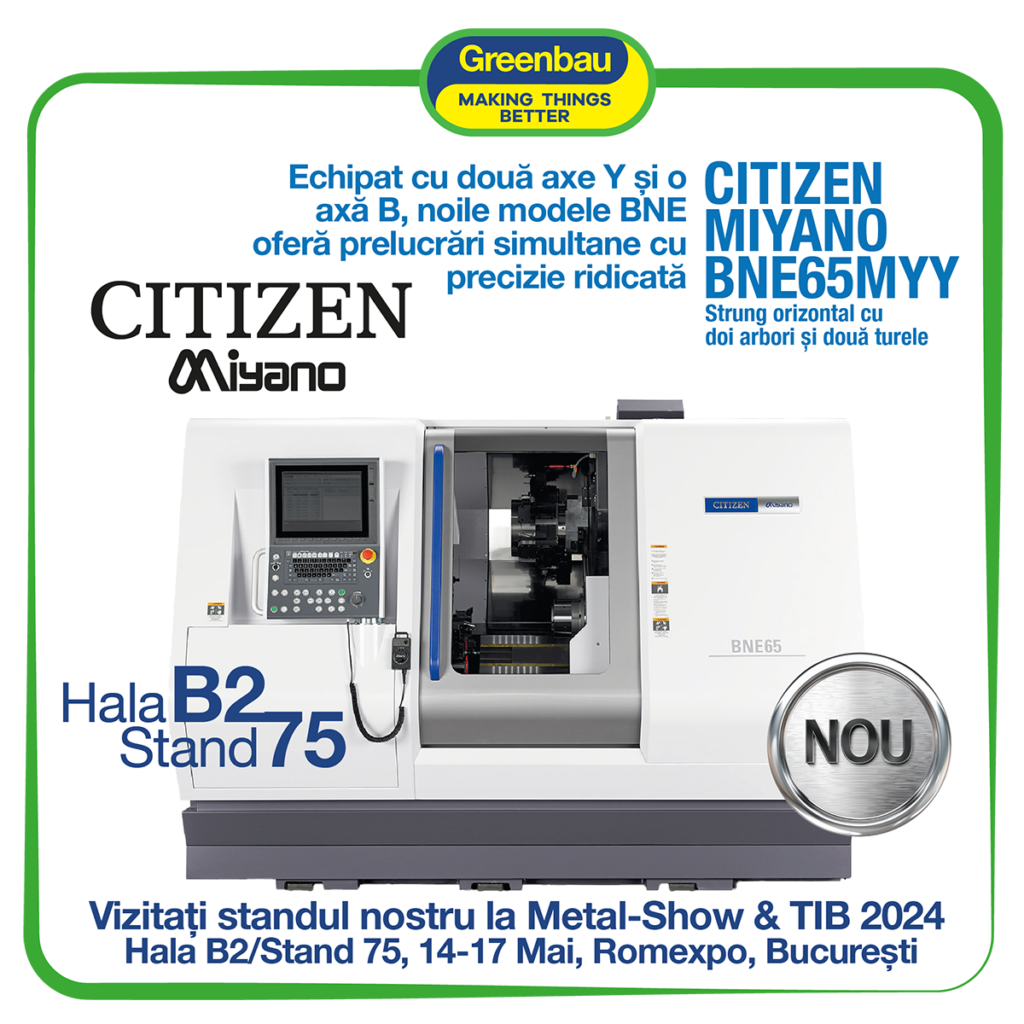 Anul acesta GreenBau Tehnologie v-a expune la MetalShow & TIB 2024, în Stand 75 Pavilion B2, mașini-unelte CNC prelucrare prin așchiere OKUMA, strung swiss-type CITIZEN Cincom și strung cu doi arbori și două turele CITIZEN Miyano BNE65MYY, mașină de rectificat Okamoto și un sistem de automatizare concept propiu Flex-Gantry, în premieră.