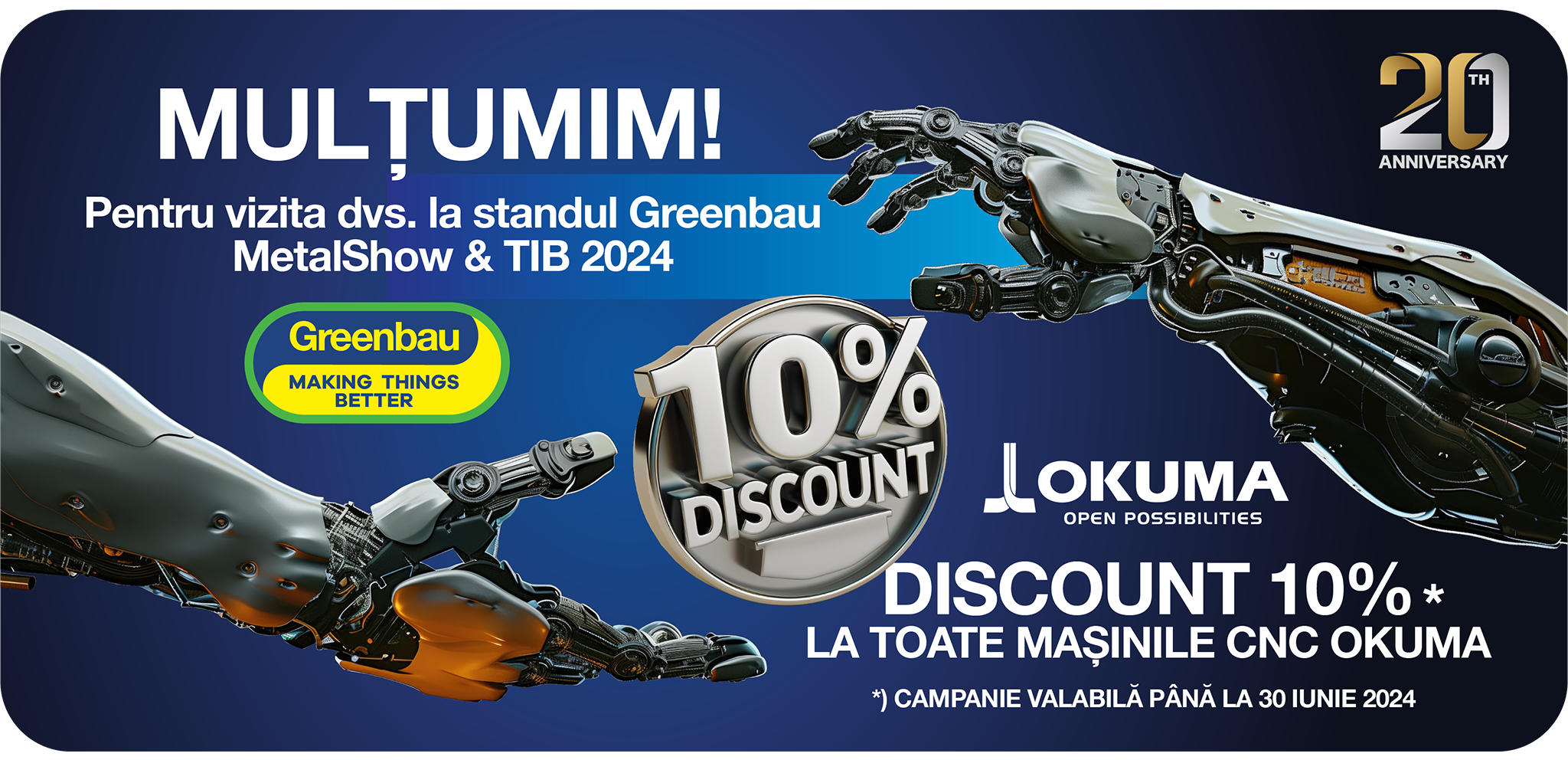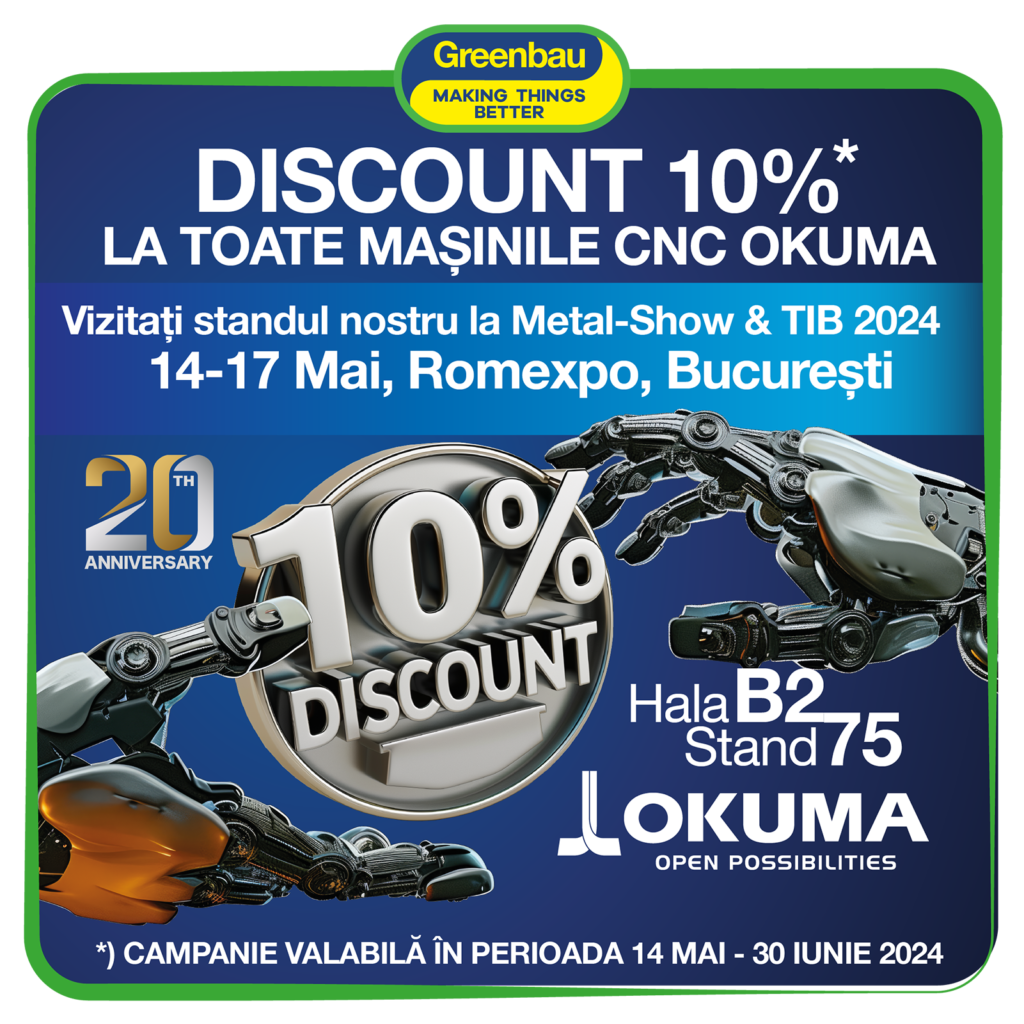 Începând cu 15 mai și până pe 20 iunie 2024, puteți obține mașinile unelte CNC din gama Okuma cu un discount incredibil de 10%! Profitați acum de această oportunitate unică pentru a aduce în compania dumneavoastră tehnologia de vârf și performanța excepțională pe care le oferă mașinile CNC Okuma. Fiți gata să vă ridicați producția la un nivel superior și să vă depășiți concurența! Nu ratați această șansă – contactați-ne de astăzi și aflați cum puteți beneficia de această ofertă senzațională!