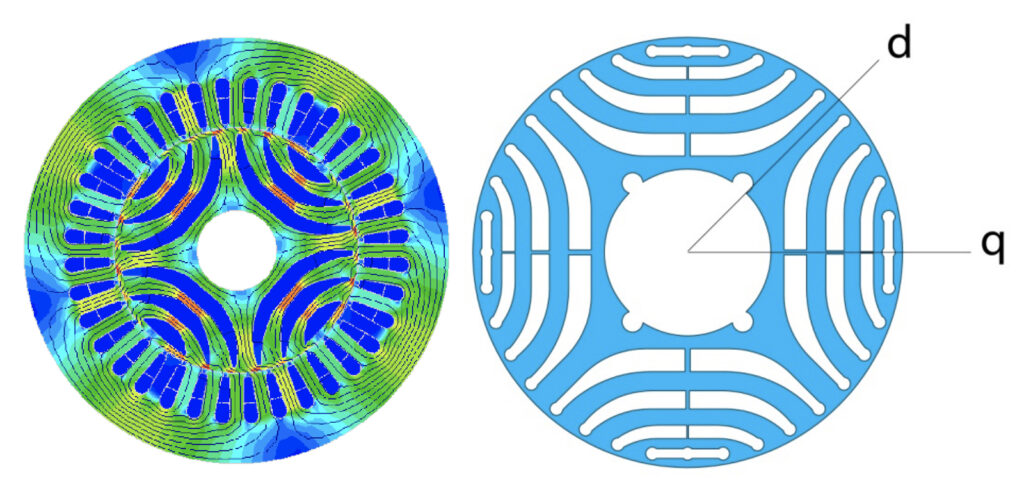 Motoarele de reluctanță sincrone sunt proiectate intenționat cu rotoare realizate cu fante „identificate” (în funcție de numărul de poli) și sunt realizate cu conductoare magnetice material (fier) și izolator magnetic material (aer).