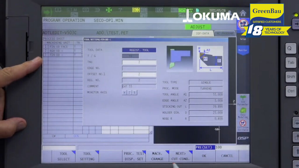 Observ că am finisare și degroșare cu aceeași sculă, scula nr. unu, observ aici scula nr. 1, pot acum sa intervin, și să-mi aleg sculă de finisare, și mi-aleg scula nr. 2 pentru că știu că aceasta e sculă de finisare. De unde știu pentru că mă informează aici FINISH OD, finisare pentru exterior. SELECT.