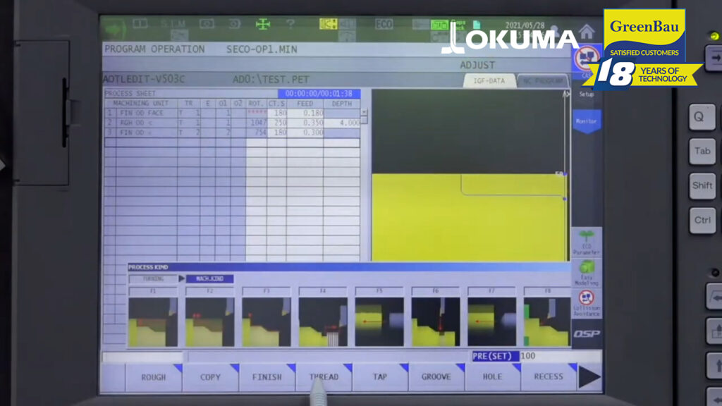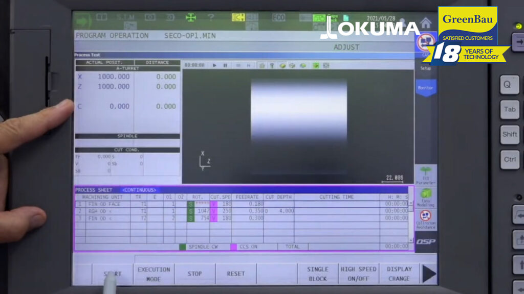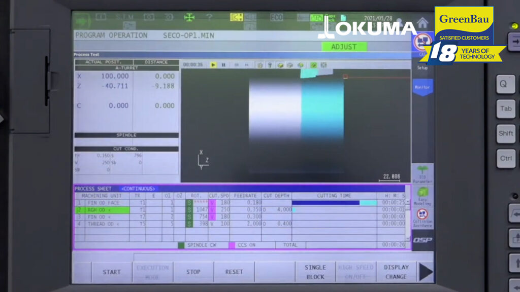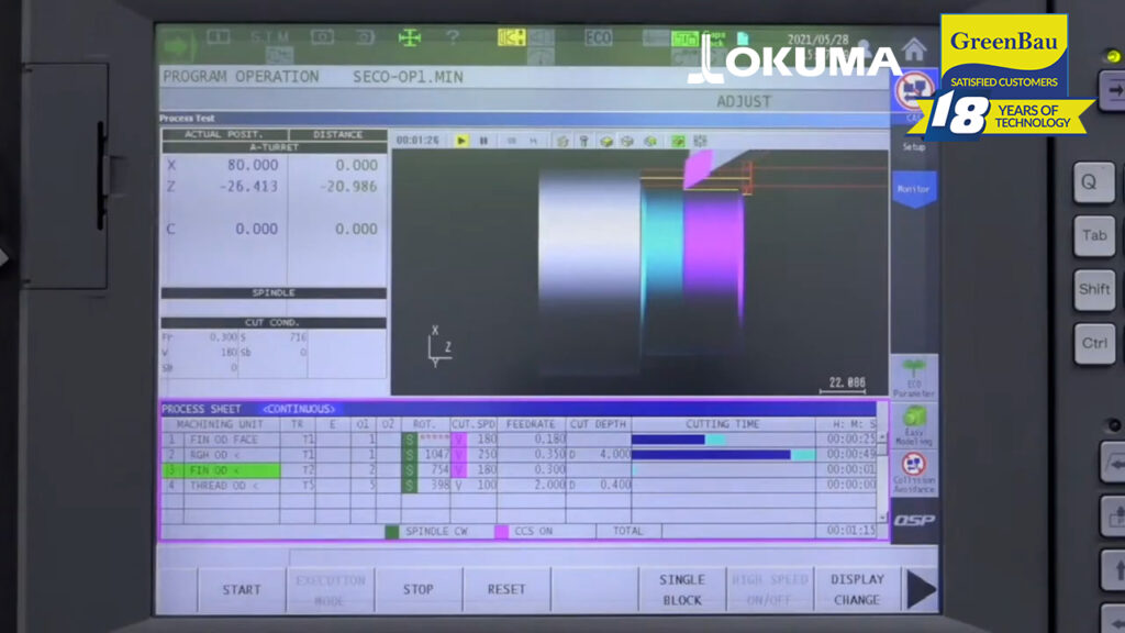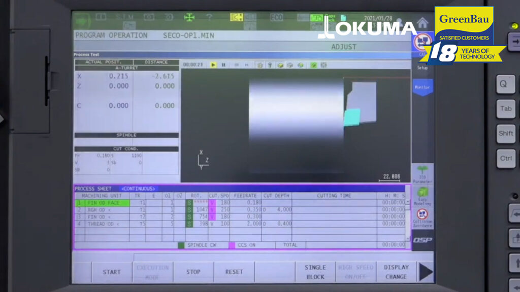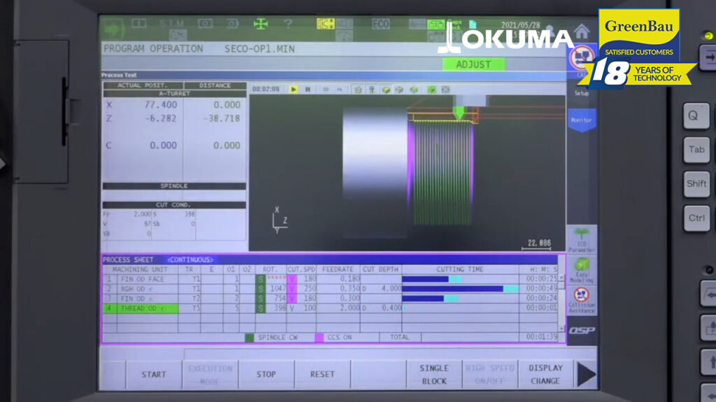 În regulă, e finalizat filetul, și în acest moment putem să executăm testarea de process, START, strunjire frontală, strunjire dregroșare exterioară, finisare exterioară și filetare.