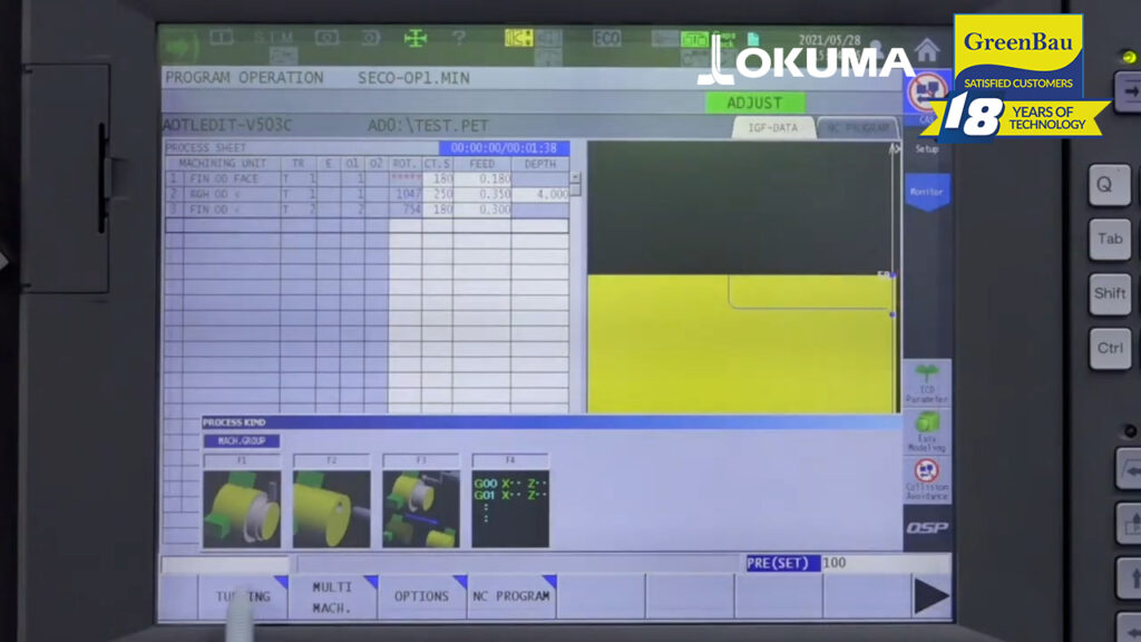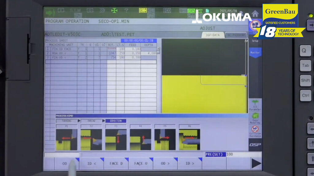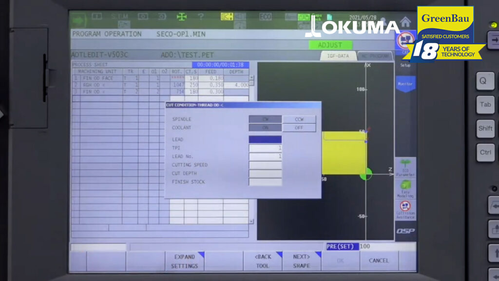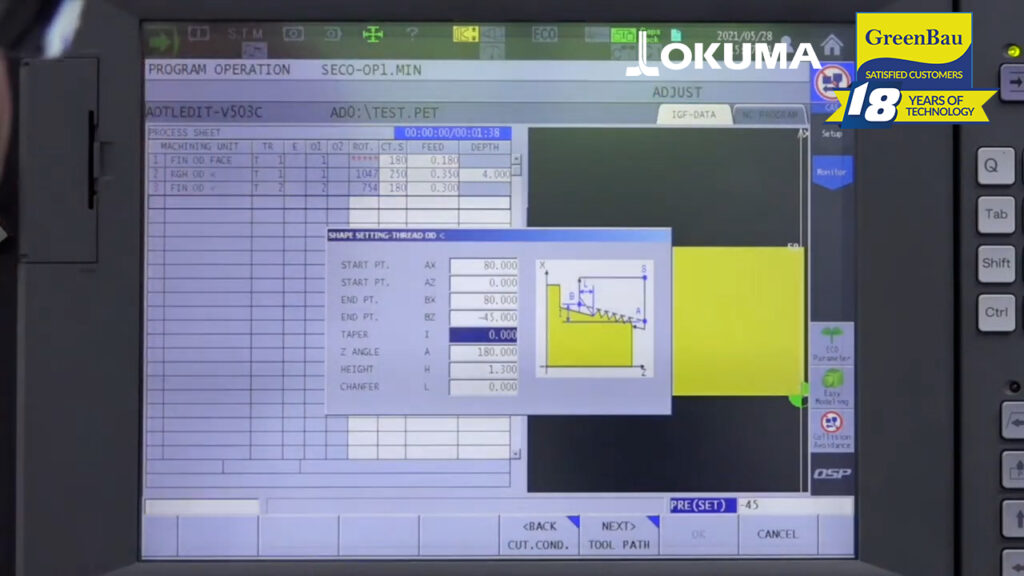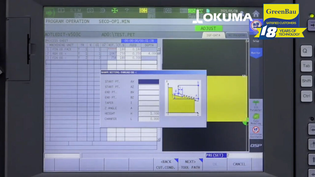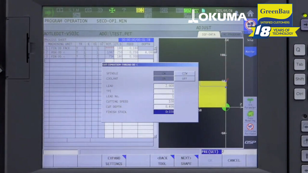 Numărul de treceri, LEAD NO., o trecere, avem posibilități să facem cu două sau trei sau mai mult începuturi, și automat ne-a pus viteza de tăiere, adăncimea de tăiere pe trecere și adausul de finisare pentru ultima trecere. Am finalizat.