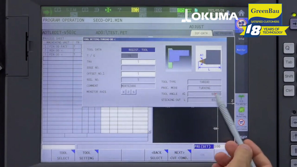 Deja softul știe că vreau să fac filetare mi-a recomandat imediat scula de filetare, observați aici avem unghiul A1 de 60 de grade, profilul plăcuței este după cum reiese de aici la 60 de grade unghiul filetului, vrem să facem un filet ISO, standard metric.