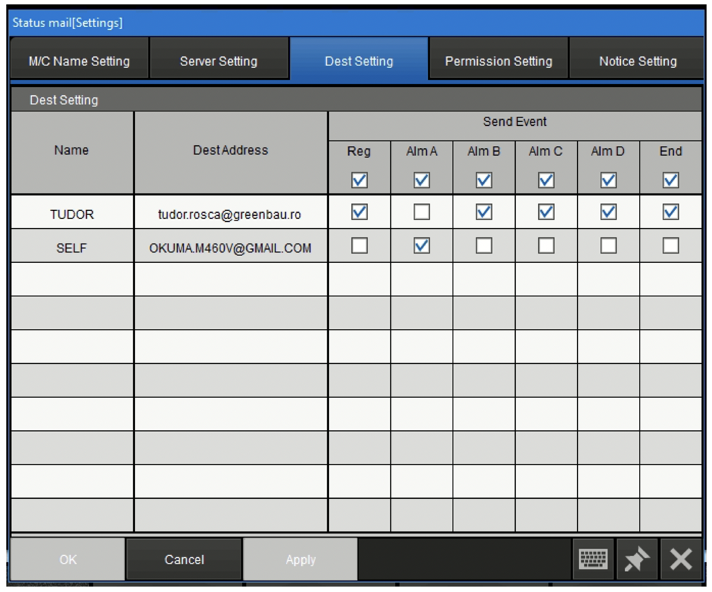 STATUS MAIL: notificări pe email referitor la starea de funcționare a masinii CNC