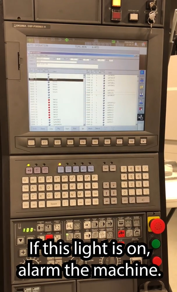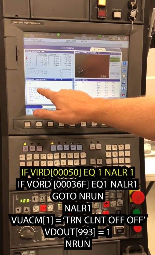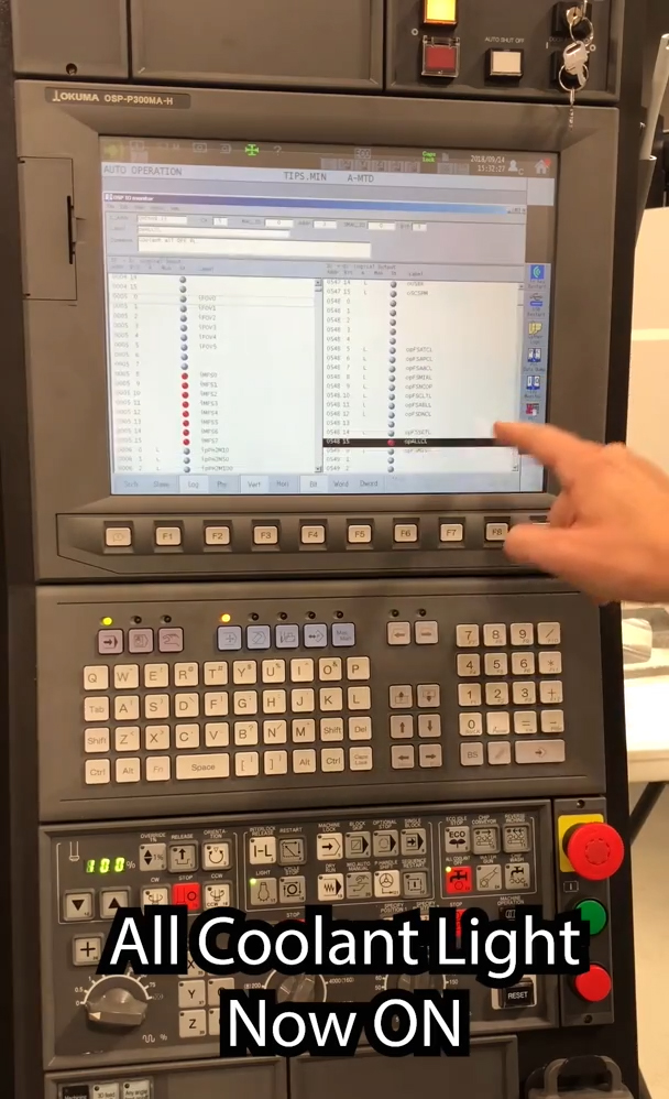 Ceea ce facem este să verificăm dacă operatorul are în prezent butonul „All Coolant Off” activat și, dacă da să declanșeze alarma, oprind mașina din prelucrare, și, sperăm, prevenind orice problemă în prelucrare.
